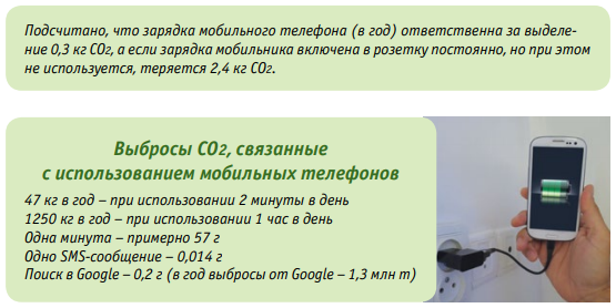 Выработка 1 кВт·ч в среднем связана с выбросами 800 г СО2. В центральной части европейской территории страны выбросы в 2 раза меньше, поскольку там много электроэнергии дают ТЭС на природном газе, ГЭС и АЭС, а уголь почти не используется. При использовании газа выбросы СО2 меньше, а угля – значительно больше; на современных станциях комбинированного цикла – меньше, на старых – больше. Говоря о северных и дальневосточных регионах России, где используется много угля, а транспортировка топлива требует много энергии, экономию 1 кВт·ч можно пересчитать в снижение выбросов примерно на 3 кг СО2. Тогда семейную годовую экономию трёх человек, перешедших из «средних» в «экономичные» потребители, можно оценить в 3 т СО2 в год